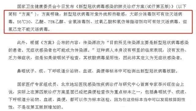 国家卫生健康委员会发布的《新型冠状病毒感染的肺炎诊疗方案(试行第五版)》(以下简称“方案”)明确,新型冠状病毒对紫外线和热敏感,大部分消毒剂可有效灭活病毒。56℃30分钟、乙醚、75%乙醇、含氯消毒剂、过氧乙酸和氯仿等脂溶剂均可有效灭活病毒,但氯己定不能灭活病毒。